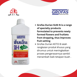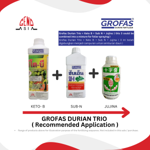 Grofas Durian is a range of specialty products formulated to prevent new durian leaves formation during the flowering season in rainy days. It also nourishes young leaves and enhances its hardening process while improving fruit setting.